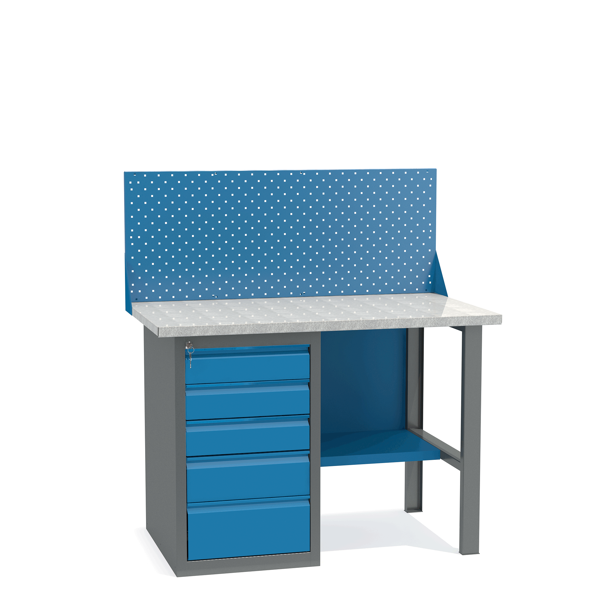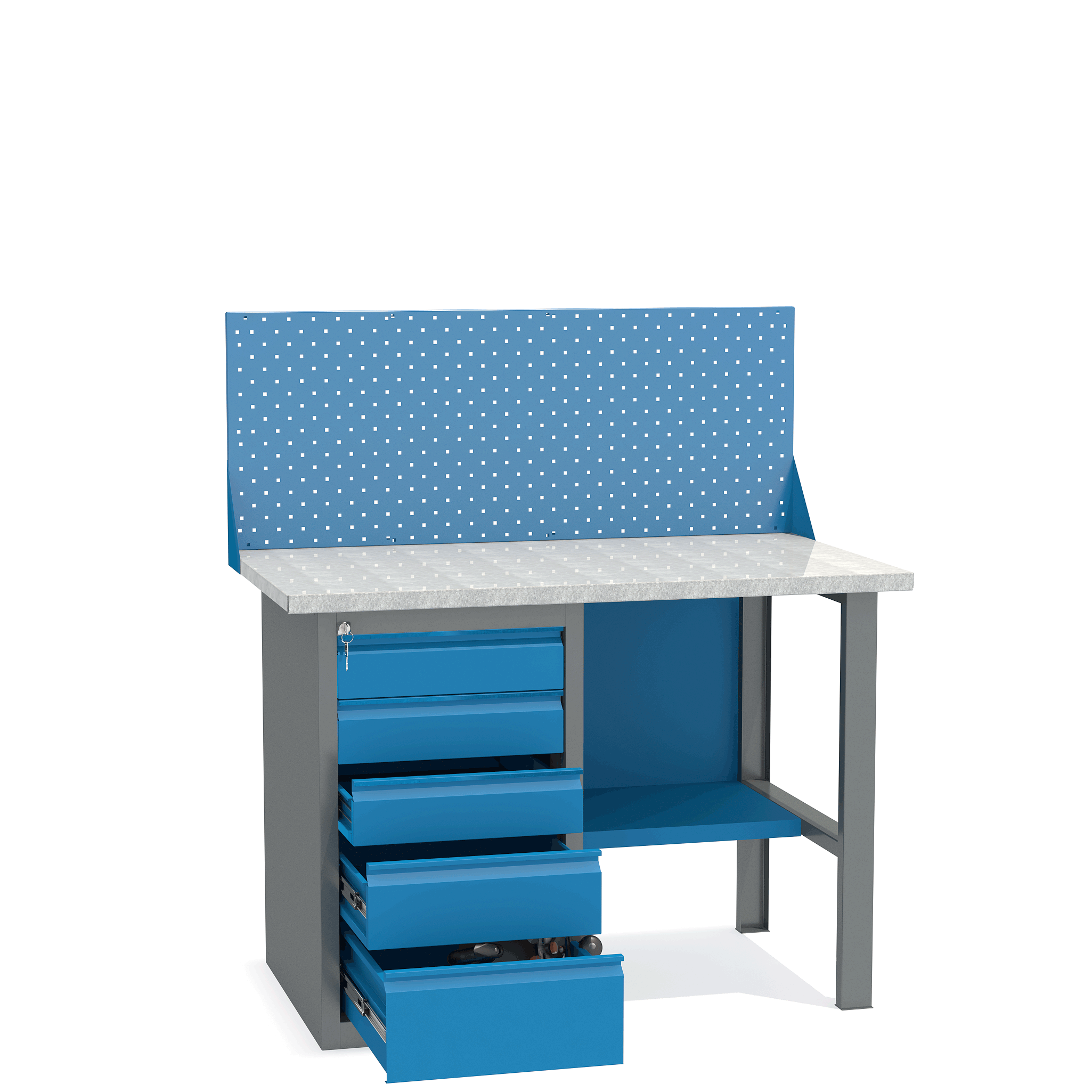 - Верстак укомплектован драйвером с пятью выдвижными ящиками разными по высоте и тумбой с полками.