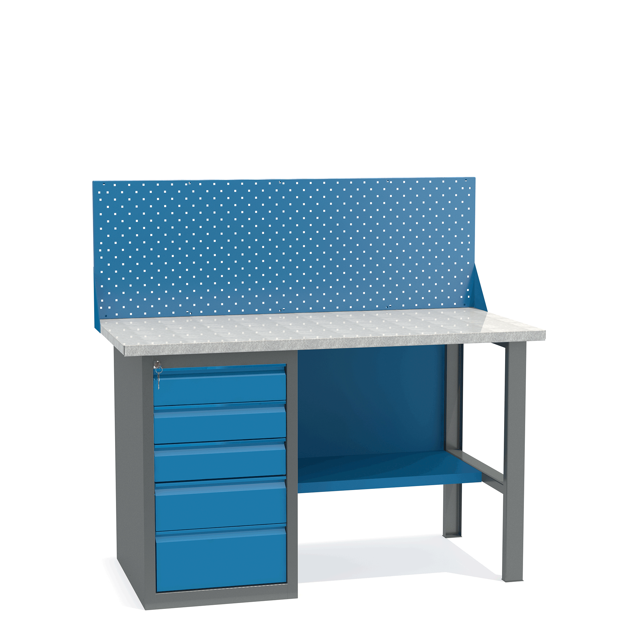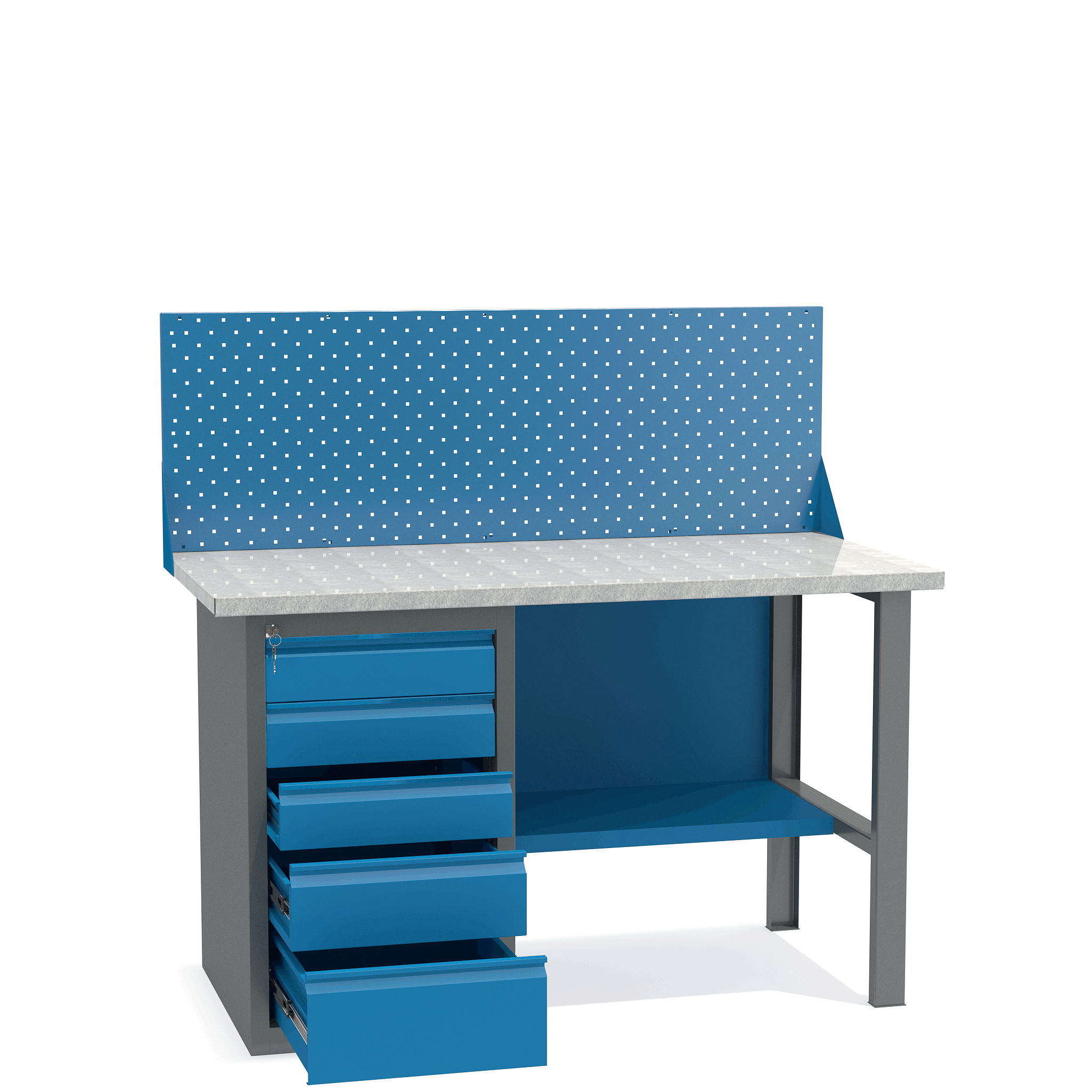 - Верстак укомплектован драйвером с пятью выдвижными ящиками разными по высоте и тумбой с полками.