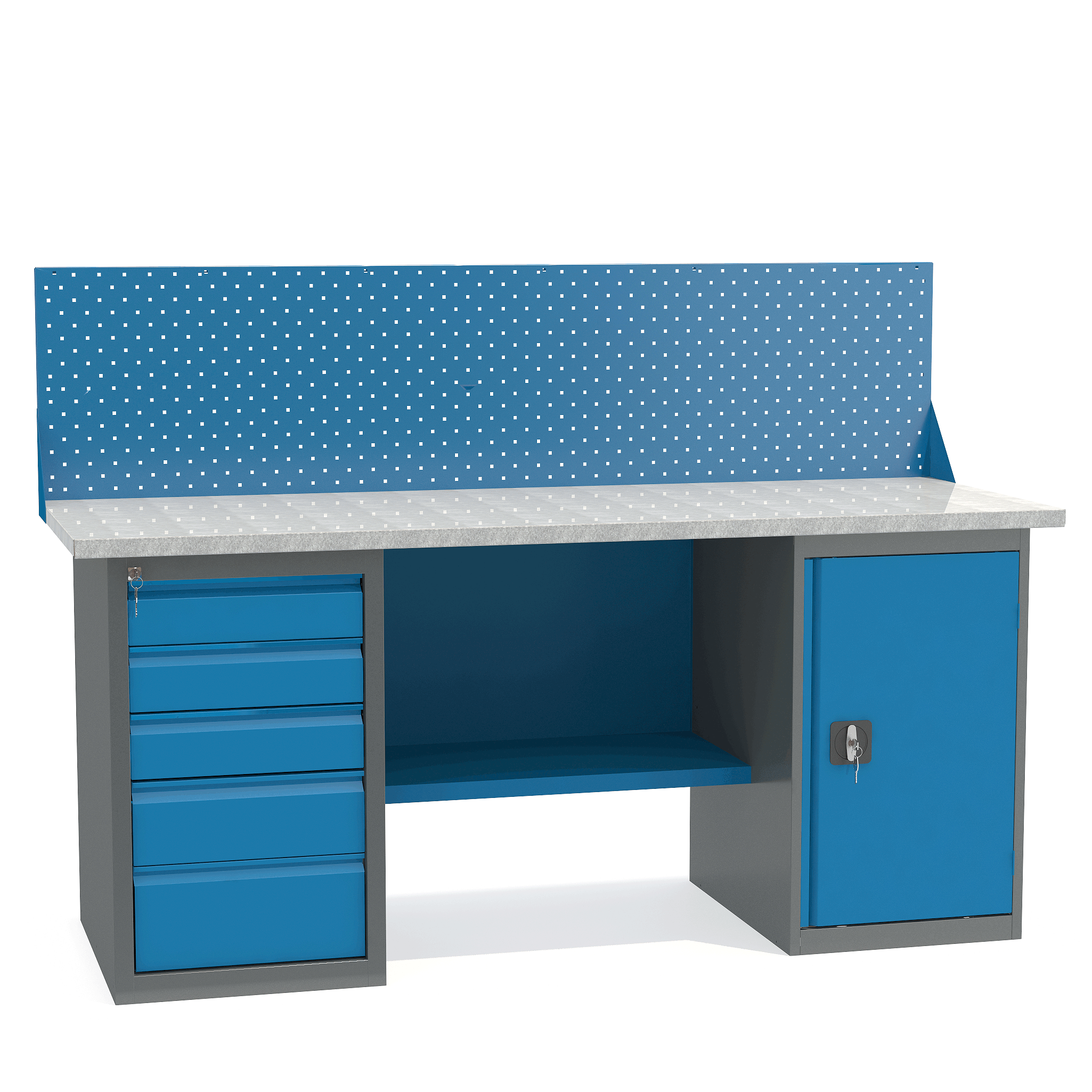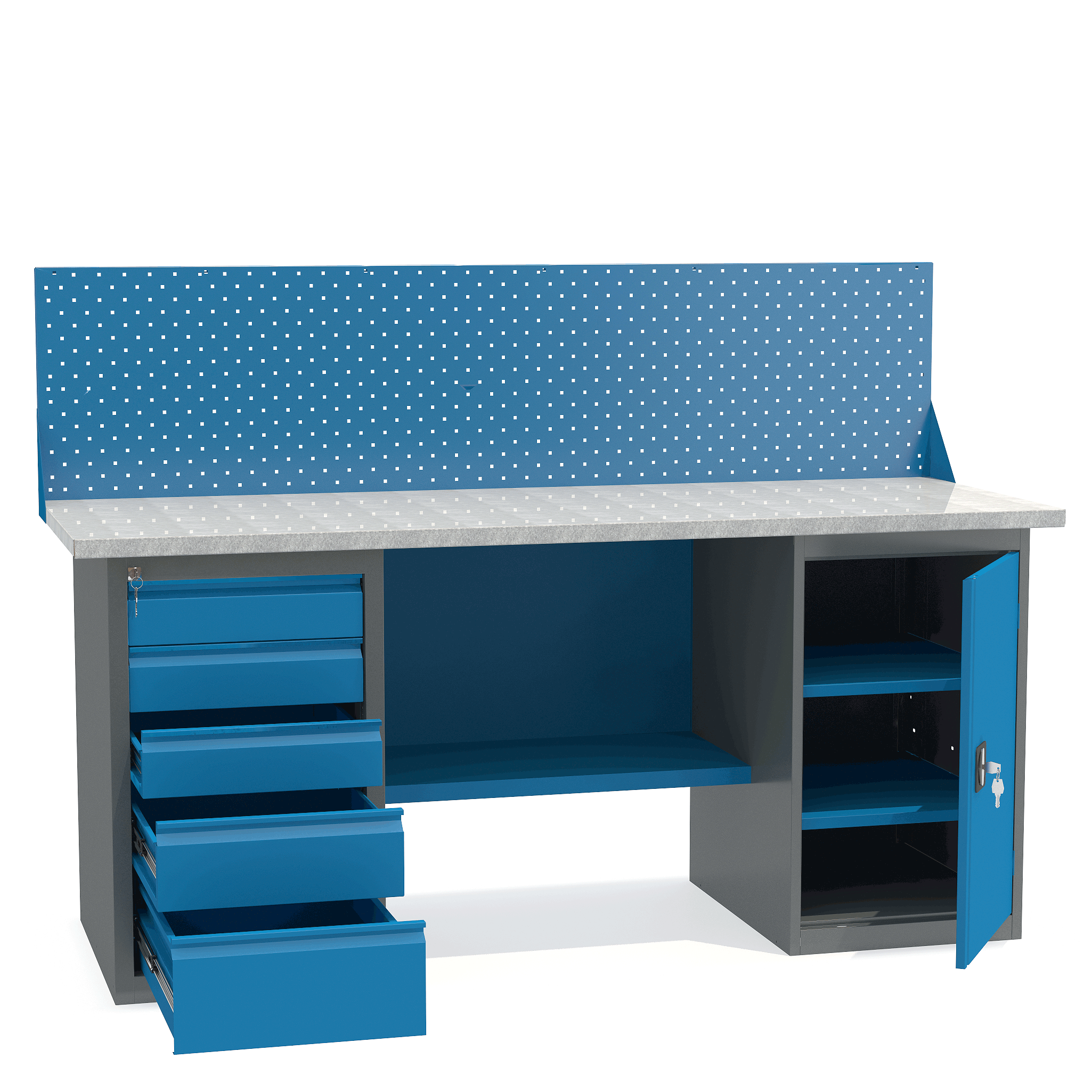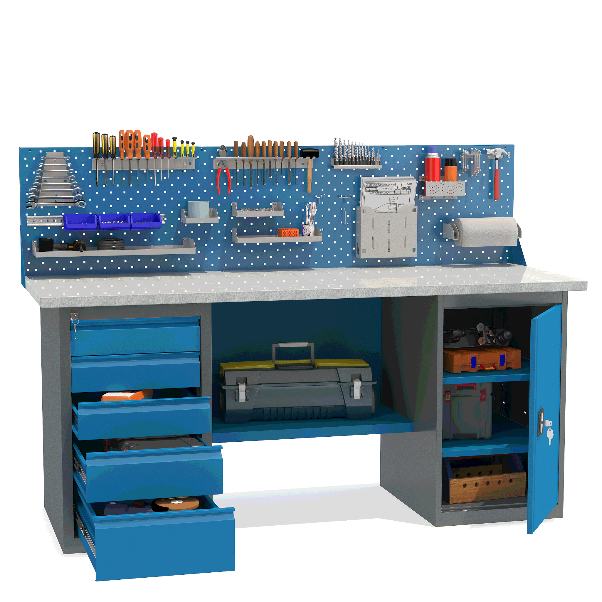 - Верстак укомплектован драйвером с пятью выдвижными ящиками разными по высоте и тумбой с полками.