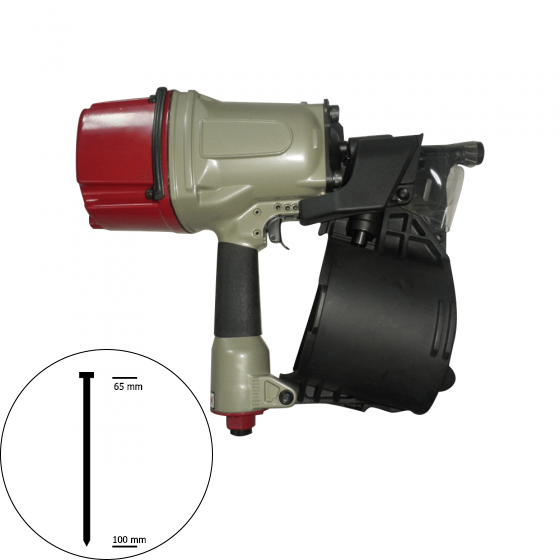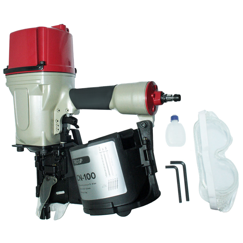 Высокопроизводительный пневматический гвоздезабивной нейлер FROSP CN-100 используется при работе с жесткими материалами и позволяет использовать гвозди диаметром 3,3 миллиметра и длиной от 65 до 100 миллиметров. Данный инструмент отличается от своих аналогов повышенными рабочими характеристиками при работе под давлением в 5-7 атмосфер, благодаря чему является наиболее используемой моделью данной категории инструментов.
